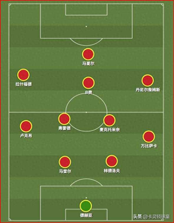 所以,曼联在进攻端就会演变成325的站位,下图就是了。卢克肖压上助攻,起到了拉宽宽度,方便拉什福德内切的作用,左脚的弗雷德就很重要了,因为弗雷德的左脚属性更适合在左路封堵、拦截。那么右路呢?很需要万比萨卡内收进来,保护林德洛夫的身侧。